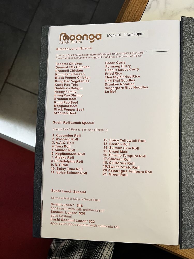 Introducing the menu at Moonga Asian Bistro, located in Kaneohe, HI. This modern bistro offers a diverse selection of Asian cuisine with a focus on Japanese flavors. From fresh sushi and sashimi options to flavorful soups like hot and sour, miso, and egg drop, the menu caters to a variety of preferences. The salads, including lobster avocado and spicy crab meat, are refreshing and packed with unique flavors. The restaurant also offers lunch specials, such as Pad Thai and General Tso's chicken, perfect for a quick and delicious meal. Customers have praised the friendly service, clean environment, and fresh ingredients used in the dishes. Whether dining in or opting for delivery, Moonga Asian Bistro promises a satisfying and enjoyable experience for all.